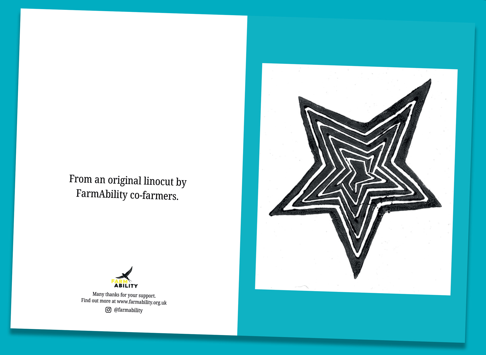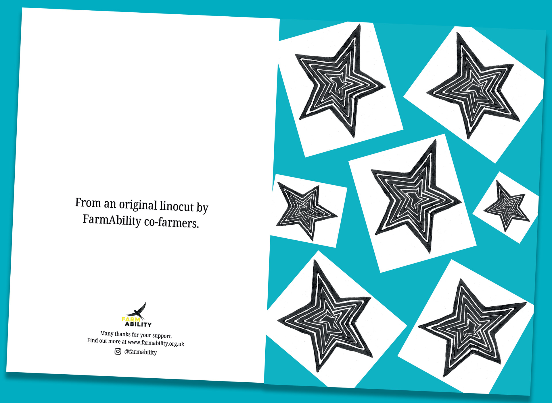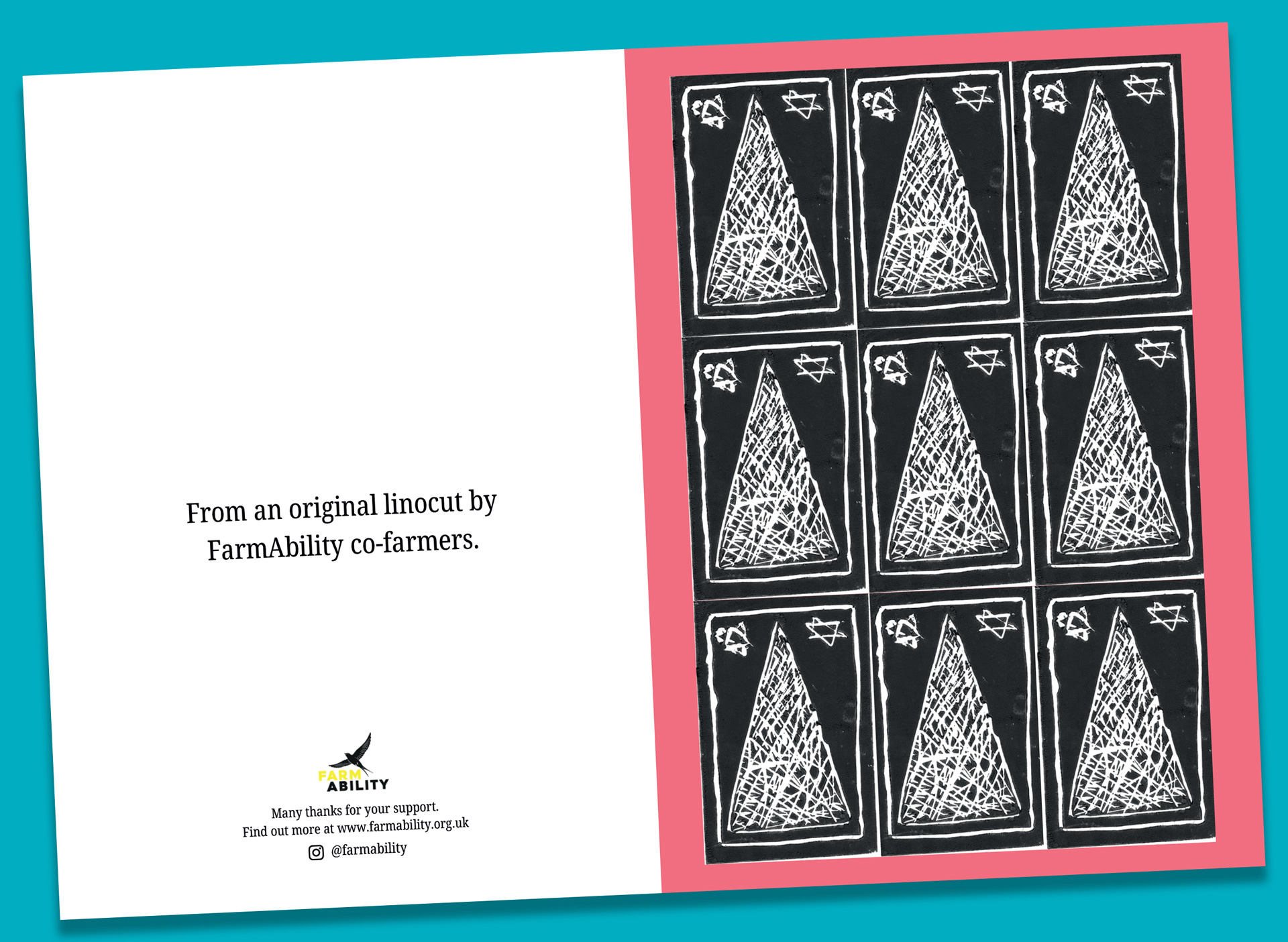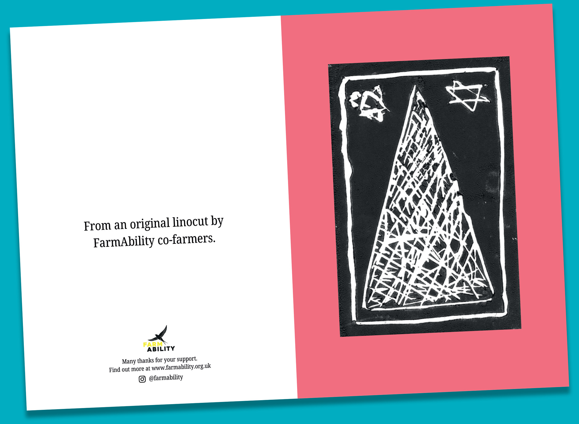 Also available are packs of 4 Christmas cards, printed on recycled board, created from original linocuts by FarmAbility co-farmers in craft sessions with our very own Rosie. Buy a pack of 4 cards and treat friends and family to a unique seasonal greeting direct from the farm while helping us raise funds!
